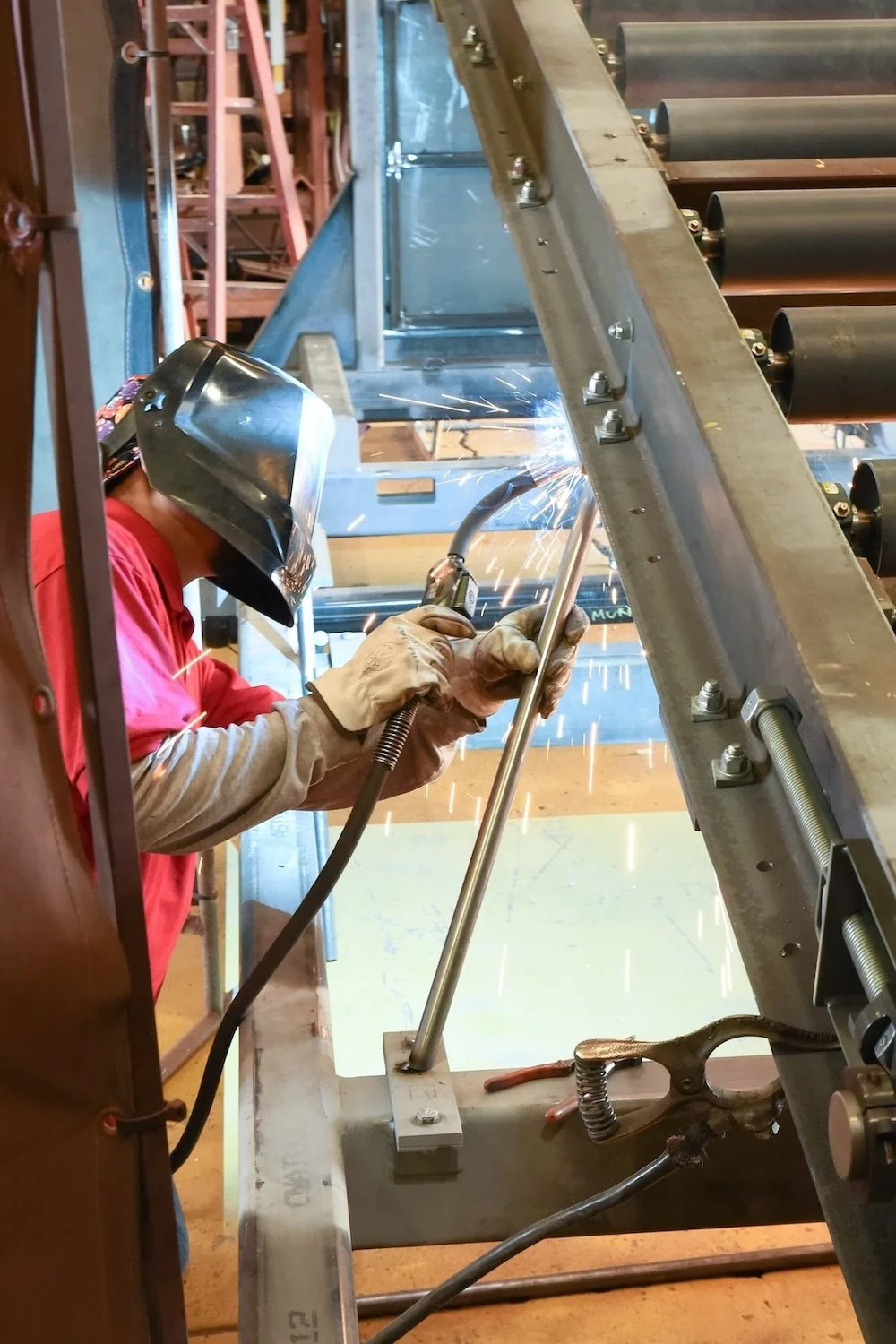 A person wearing a welding helmet, gloves, and a red shirt welding a metal pipe, with sparks flying from the welding process.